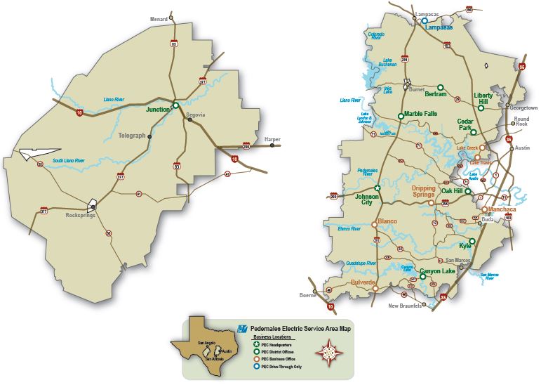 PEDERNALES ELECTRIC COOPERATIVE (PEC): Headquarters: 1-888-554-4732; 830-868-7155; 302 S Ave F, Johnson City, TX 78636. pec.coop.