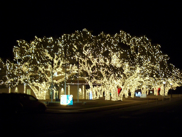 Nearby, the local Pedernales Electric Co-Op headquarters won't be outdone. An entire block of magnificent old oak trees strung with 1+ million white lights covering the entire canopy of each tree plus white trunks, along with the stately two story PEC HQ building, are simply brilliant. Nearby trees are in other complementary colors, creating another visual armada the likes of which I have never seen.
