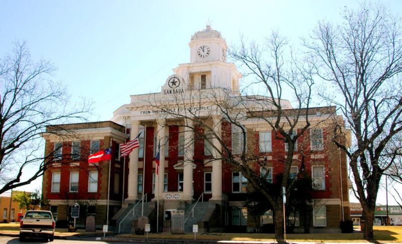 - San Saba County Courthouse: Started in 1911, completed 1915 at a cost of $75,000. Brick & sandstone construction. Texas Renaissance style. Third courthouse built in San Saba