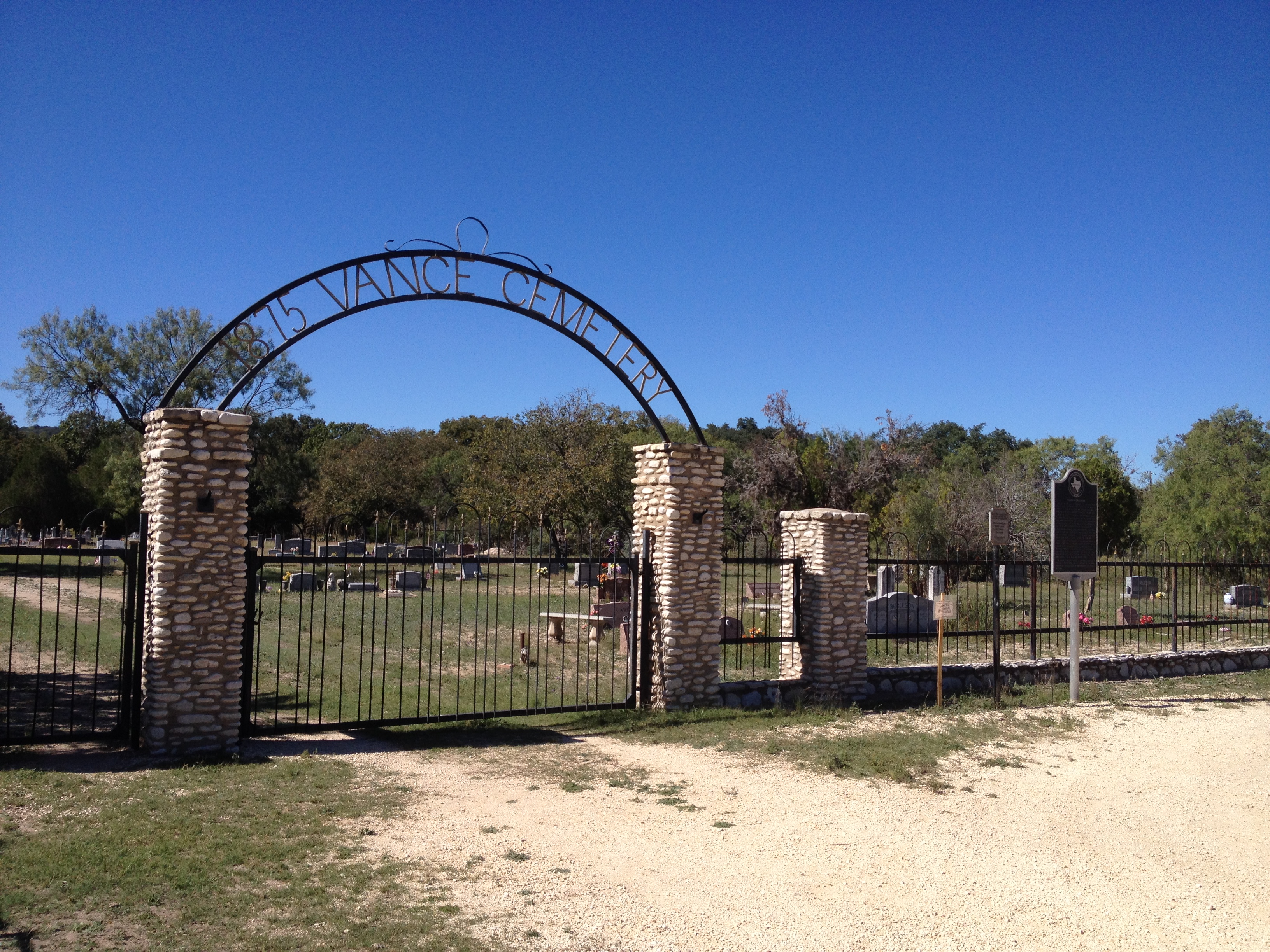 HISTORY: Handbook of Texas Online: "In 1874 Henry Wells moved to the area and was soon followed by others. The community was originally called Bullhead, deriving its name from Bullhead Mountain just to the north. A Baptist church was founded in 1875, and the Bullhead Post Office was established on July 1, 1878. In 1883 the townsite was formally laid out, and in that same year Edwards County was also established. Bullhead served as county seat from September of that year until sometime in 1884, when voters moved the county government to Leakey. In 1886 the town was renamed after Xavier Wanz (sometimes written Vance), who joined Castro's Colony in 1845 and who pursued Indian raiders into the area and recovered a stolen herd of horses in the 1860s. In the 1880s Vance had two stores, a Baptist church, a school, a saloon, and, temporarily, the Edwards county courthouse, but its decline began not long after. Twentieth-century population estimates were below fifty. The post office was finally closed on January 31, 1955, and by 1985 only the Baptist church and cemetery and a few scattered homes remained at the site."