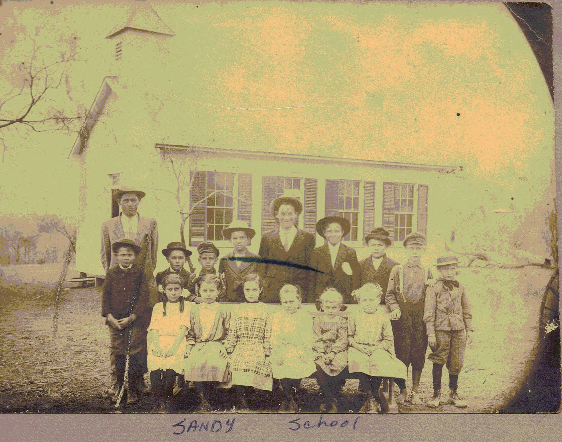 Historic School Photo: This photo was submitted by Joe Ashabranner, August, 2013, who stated: "The teacher in the [lower] picture is my grandfather Nick Hornsby [on left]. I know he was the teacher for at least 2 years. My grandmother, Jesse Smith Hornsby, probably took the picture. I hope that you and the others may be able to help identify some of the places and people." Undated. While labeled "Sandy School", this apparently was the Spring Creek School. Dick Hornsby was the teacher of record for Spring Creek in the 1919-20 and 1920-21 school years.