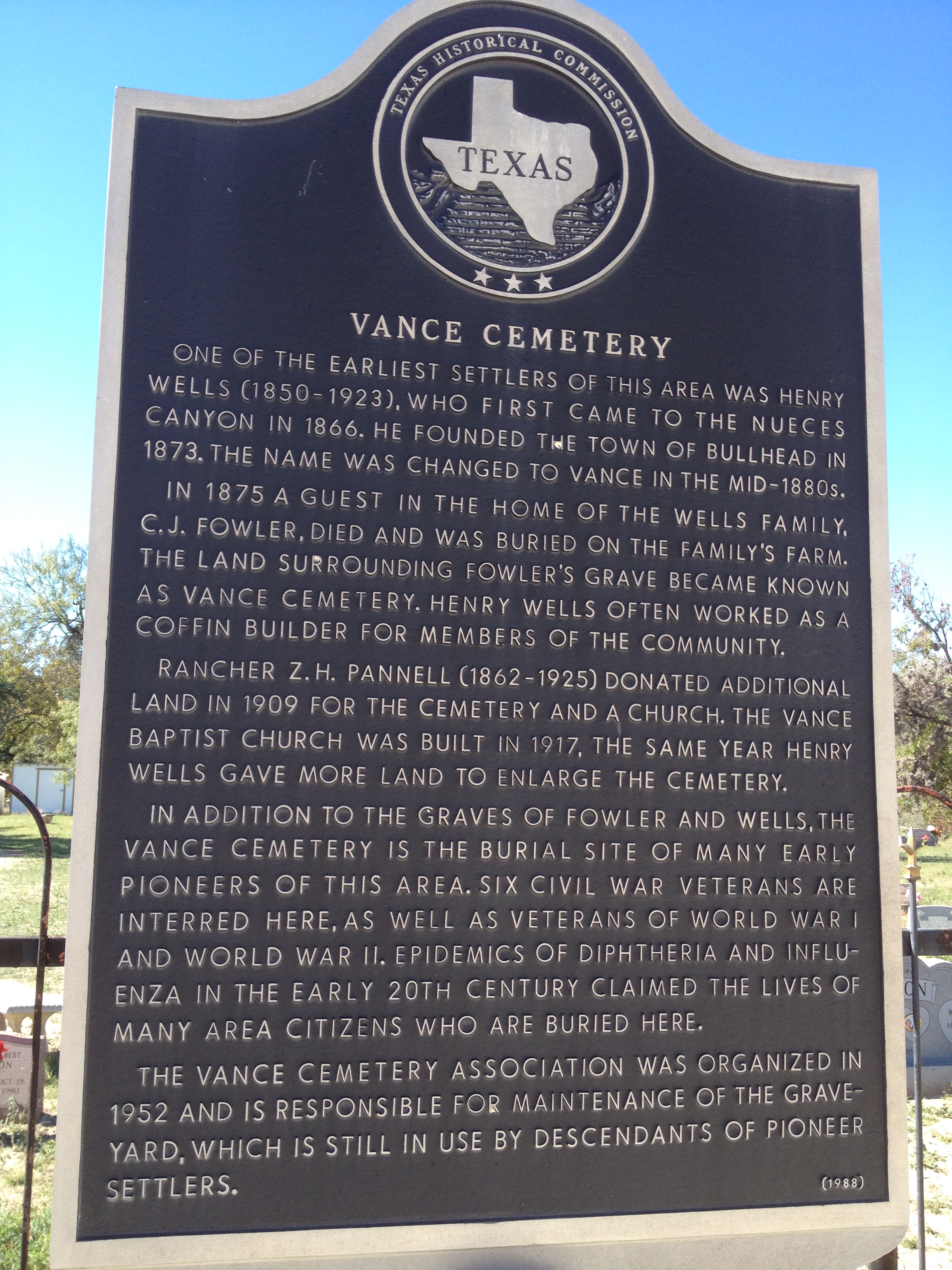 HISTORY: Handbook of Texas Online: "In 1874 Henry Wells moved to the area and was soon followed by others. The community was originally called Bullhead, deriving its name from Bullhead Mountain just to the north. A Baptist church was founded in 1875, and the Bullhead Post Office was established on July 1, 1878. In 1883 the townsite was formally laid out, and in that same year Edwards County was also established. Bullhead served as county seat from September of that year until sometime in 1884, when voters moved the county government to Leakey. In 1886 the town was renamed after Xavier Wanz (sometimes written Vance), who joined Castro's Colony in 1845 and who pursued Indian raiders into the area and recovered a stolen herd of horses in the 1860s. In the 1880s Vance had two stores, a Baptist church, a school, a saloon, and, temporarily, the Edwards county courthouse, but its decline began not long after. Twentieth-century population estimates were below fifty. The post office was finally closed on January 31, 1955, and by 1985 only the Baptist church and cemetery and a few scattered homes remained at the site."